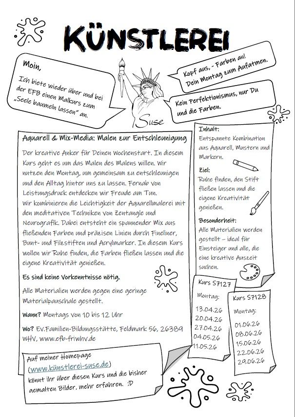 Über die EFB kannst Du Dich für die Workshops anmelden. Die verschiedenen Workshops finden entweder in Wilhelmhaven, Feldmark 56 oder bei mir in Jever, Steinstr. 2a in der Künstlerei statt. Ich biete aber auch OnlineWorkshops an.