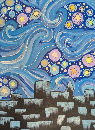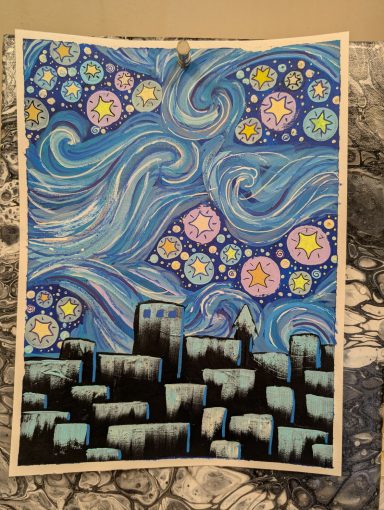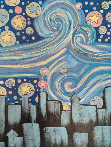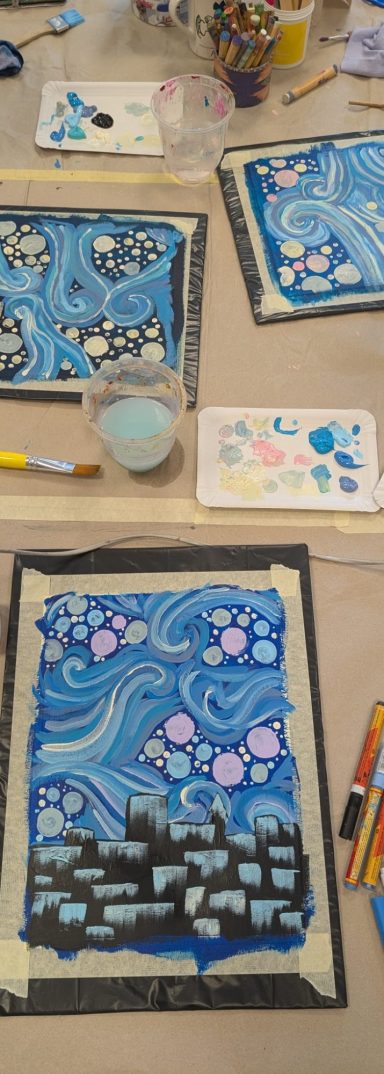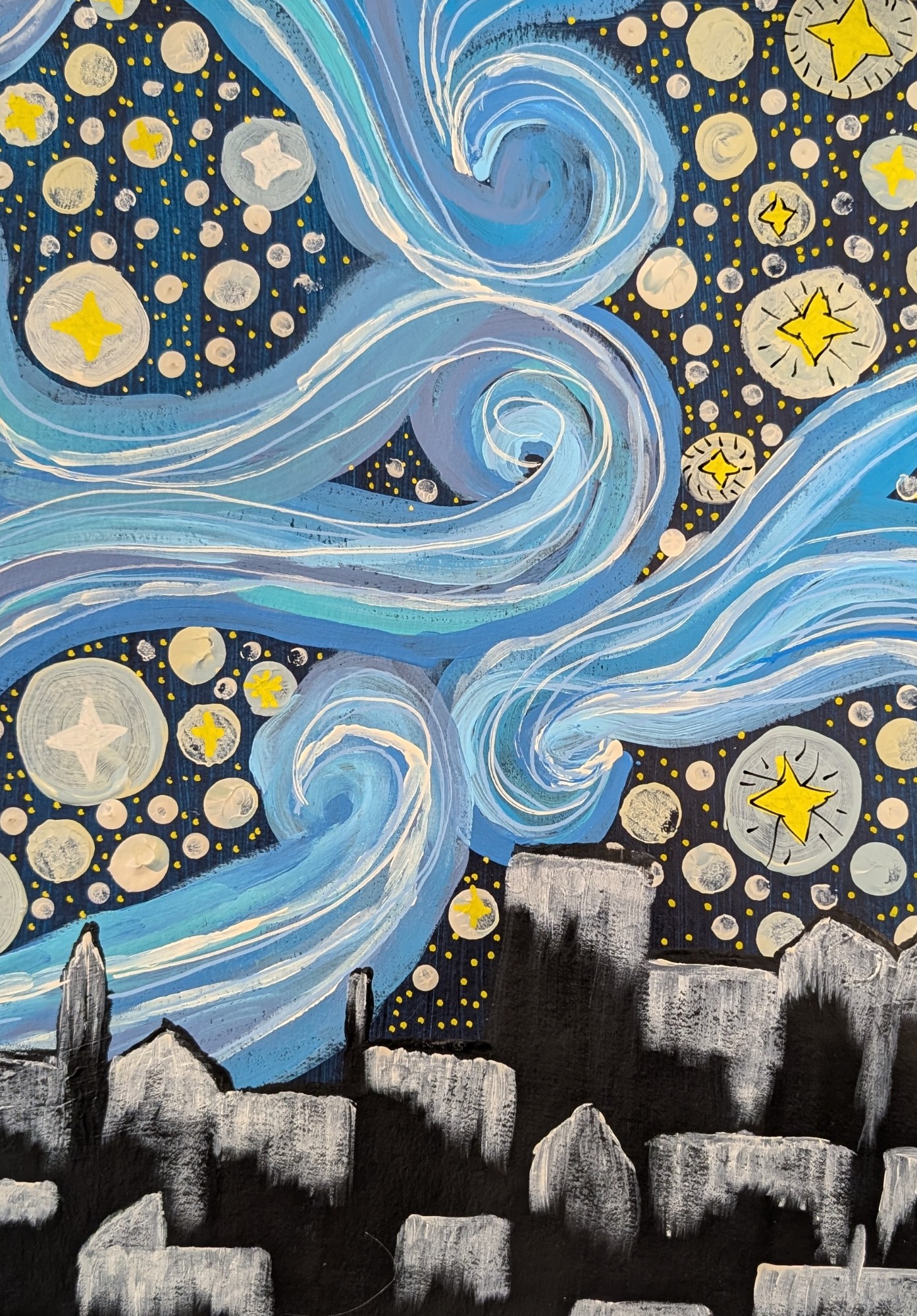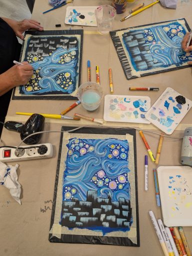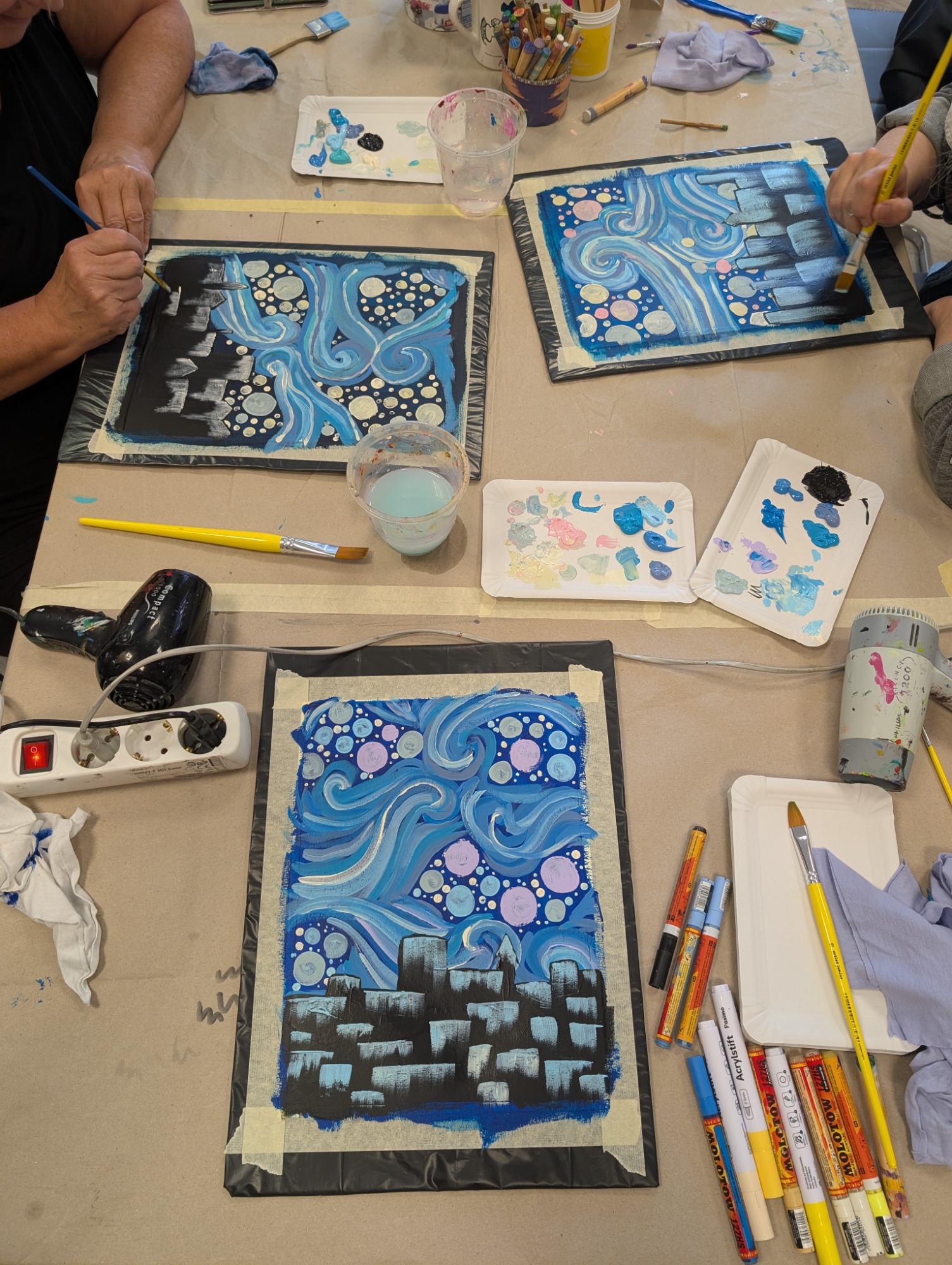 Im Workshop "Malen wie Van Gogh" haben Teilnehmer die Möglichkeit, unter der Anleitung erfahrener Künstler ihre eigene Version von Van Goghs berühmtem Gemälde "Sternennacht" mit Acrylfarbe zu kreieren. Obwohl alle den gleichen faszinierenden Himmel und die ikonischen Elemente malen, entsteht durch die individuelle Herangehensweise und den persönlichen Stil jedes Teilnehmers ein einzigartiges Kunstwerk. Jeder Pinselstrich spiegelt die eigene Kreativität wider, und so wird aus einem gemeinsamen Thema eine Sammlung von einzigartigen Interpretationen, die die Vielfalt der künstlerischen Ausdrucksform feiert.